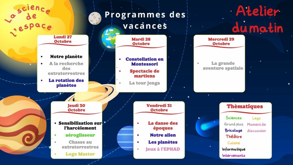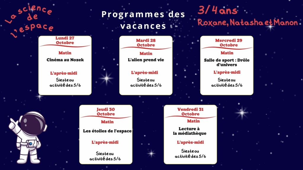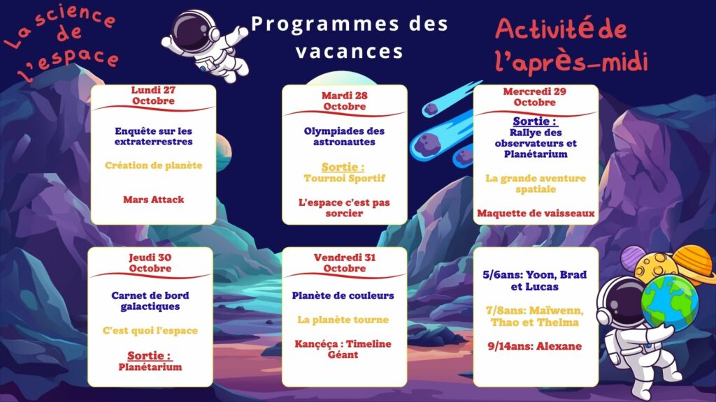 Vacances Programmes des vacances d’octobre du 27 au 31 Précédent Programmes des vacances d'octobre du 20 au 24 Plus récent Les sorties des vacances du 20 au 24 octobre