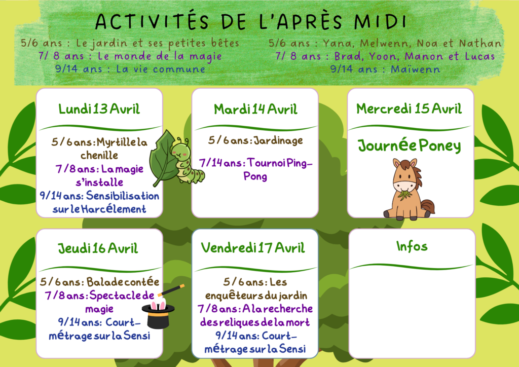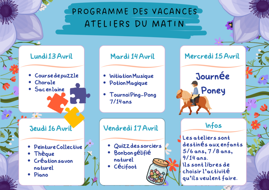 🐴 Concernant la sortie poney : il ne sera pas possible de s’inscrire uniquement pour cette journée. Une inscription d’au moins 2 jours sur la période des vacances est demandée.